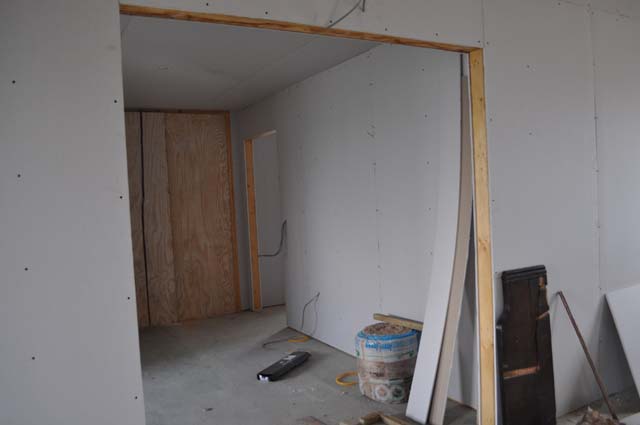 The main entrance of the church has now been plasterboarded. The entrance on your right leads to the kitchen.